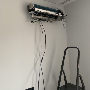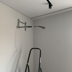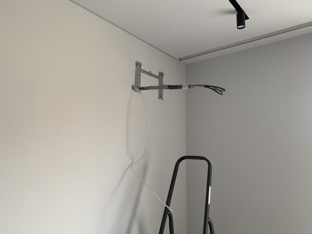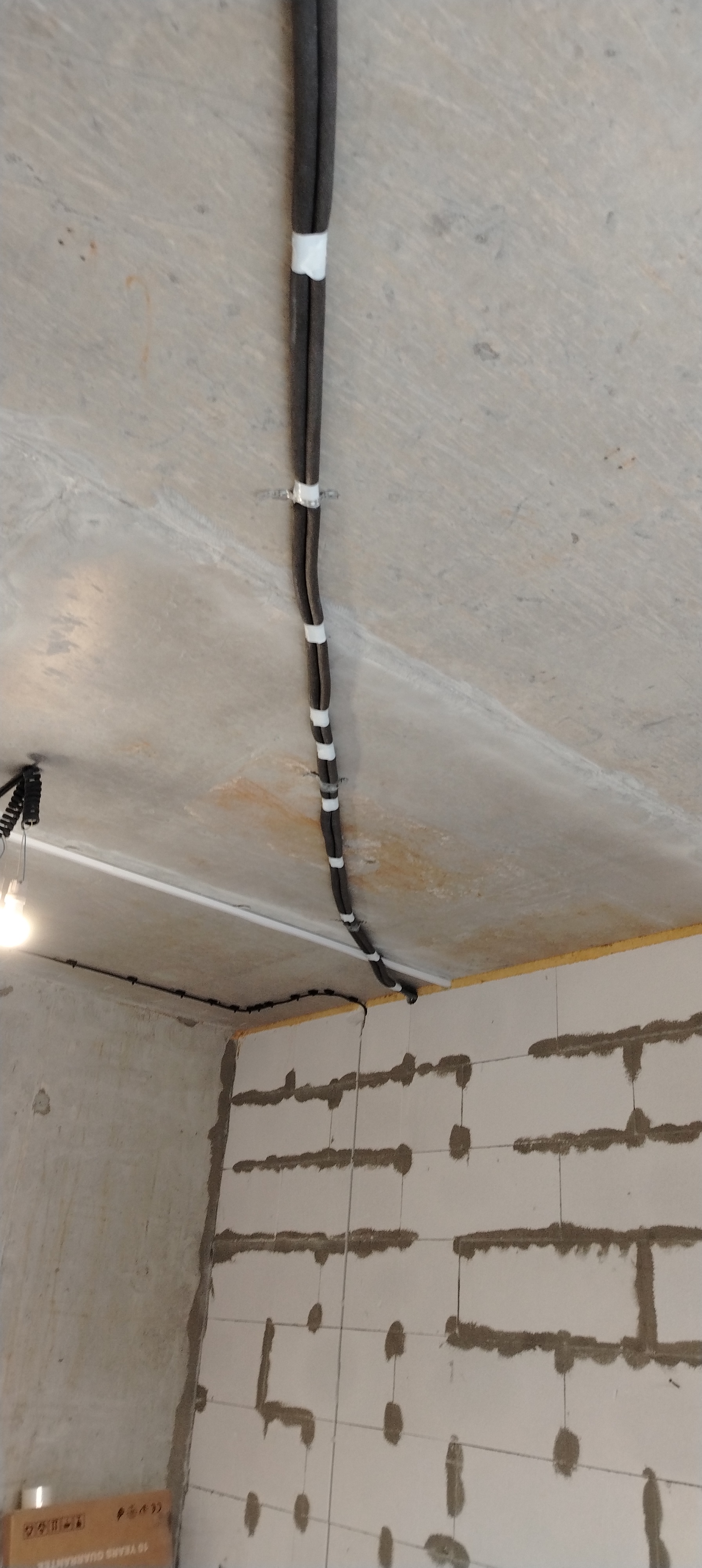 Фреоновые трассы и кабель проложены по потолку (впоследствии коммуникации закроются натяжным потолком), что позволит полностью скрыть коммуникации.