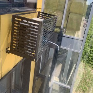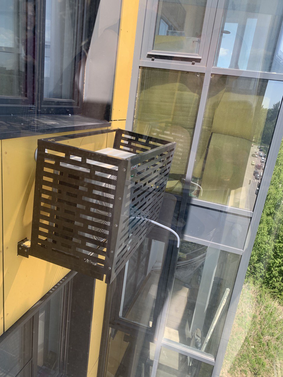 На фасаде здания, в специально подготовленную металлическую корзину, установлен наружный блок BALLU BA2OI-FM/out-18HN8/EU мощностью 5,3 кВт по холоду. Корзина обеспечивает надёжную фиксацию блока, защиту от падения, эстетичный внешний вид и безопасность для прохожих.