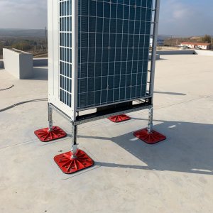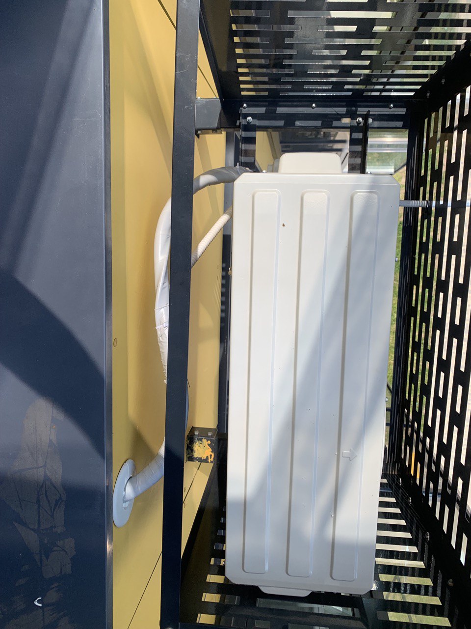 Монтаж наружного блока на отмостку: Наружный блок установлен на отмостку здания на специальную металлическую подставку. Такое решение позволило полностью исключить передачу вибрации и шума от работающего компрессора на каркас дома, обеспечив комфортную эксплуатацию системы .